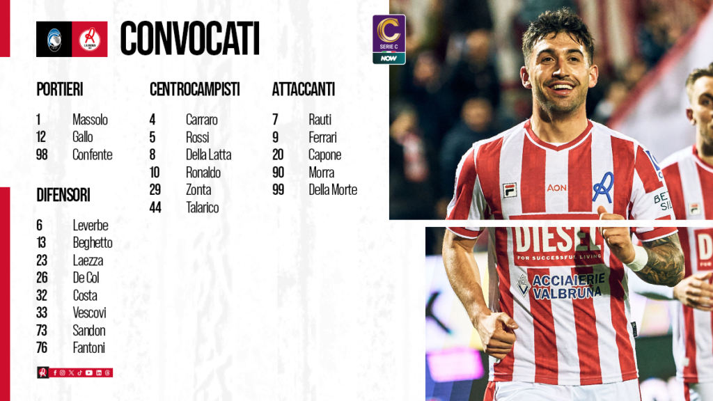 Lāelenco dei 22 giocatori biancorossi convocati da mister Vecchi per la trentesima giornata di campionato Serie C Now contro lāAtalanta U23, in programma domani, domenica 9 marzo alle ore 12:30, allo stadio comunale di Caravaggio.