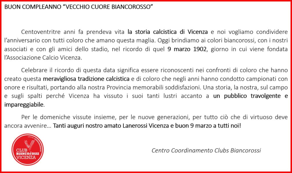 Pubblichiamo il messaggio che oggi, giorno del 123° compleanno del Lane, ha diffuso il Centro di coordinamento dei club biancorossi presieduto da Emanuele Arena. Una giornata di festa, a prescindere da qualsiasi risultato.