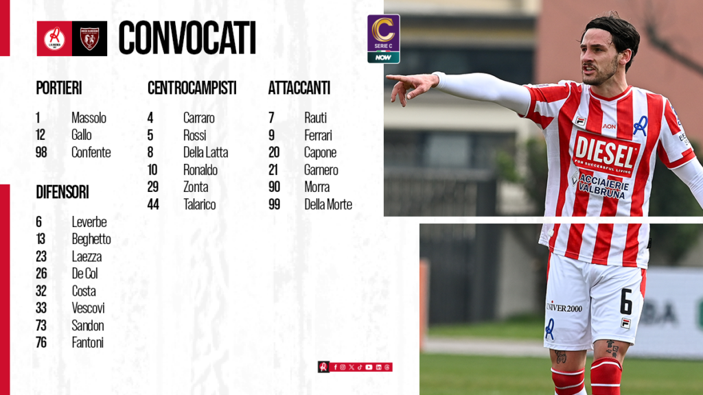 L’elenco dei 23 giocatori biancorossi convocati da mister Vecchi per la trentacinquesima giornata di campionato Serie C Now contro l’Union Clodiense, in programma domani, domenica 6 aprile alle ore 15:00, allo stadio “Romeo Menti”.
