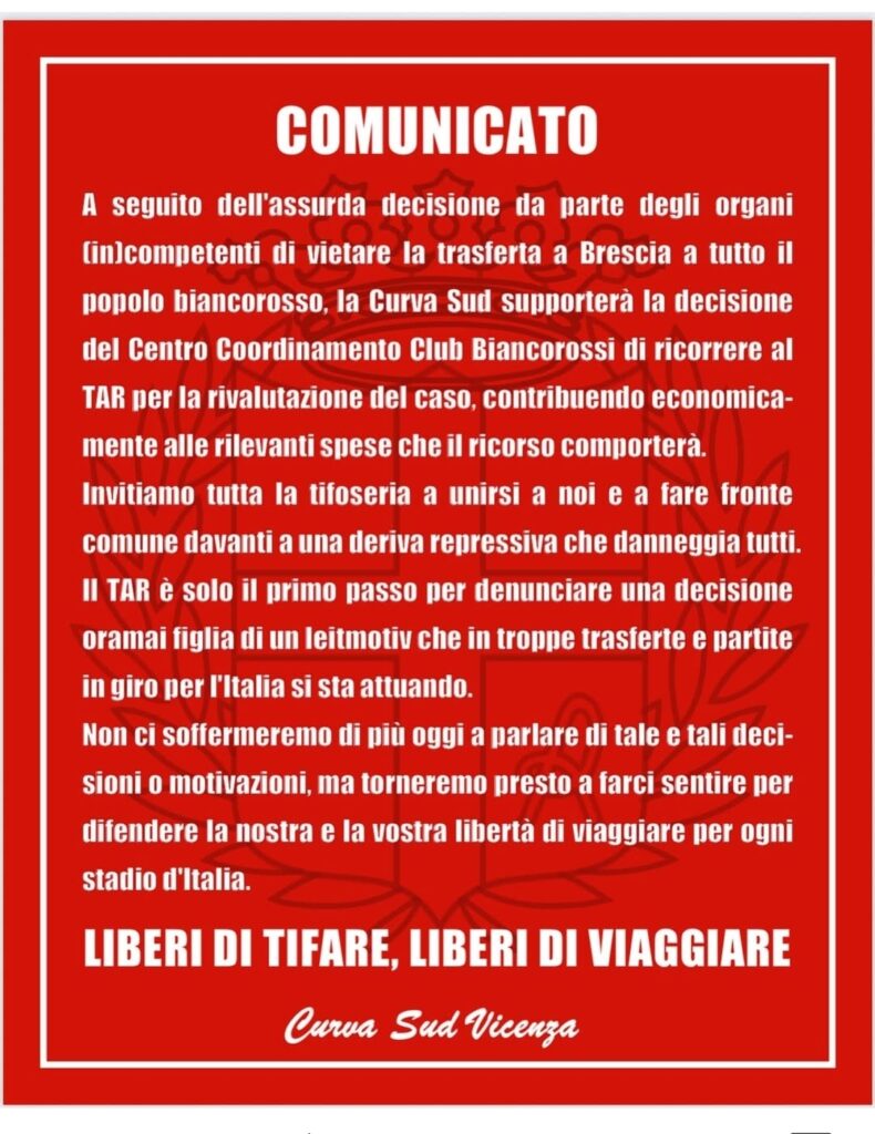 Si compatta il tifo organizzato biancorosso per provare ad ottenere il consenso a prendere parte alla trasferta di Brescia e trascinare la squadra di mister GalloĀ in uno dei momenti chiave del campionato. La Curva Sud, come comunicato sui social, si ĆØ schierata al fianco del CCCB nel ricorso presentato al TAR, anche con un sostegno economico.